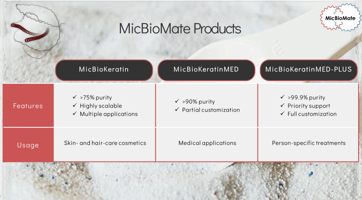 Unsere Mission ist es, die kosmetische und biomedizinische Industrie zu revolutionieren, indem wir tierisch gewonnenes Keratin und pflanzenbasierte analoge Proteine durch unsere biotechnologisch hergestellten, veganen und maßgeschneiderten Keratine ersetzen.